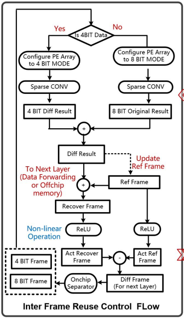 对神经网络的每一层,第一帧作为一个完整的图像进行处理,但接下来的帧仅仅处理与上一帧作差的结果,我将其称为帧间残差(difference frame)。由于帧间相似性,这个difference frame可以被量化为4b低精度矩阵与8b高精度稀疏矩阵的结合,之后可对两部分矩阵可以进行分治操作。由于ReLU操作的处理目标为原始图像,神经网络中除ReLU以外的所有操作都由difference frame作input activation。在进行ReLU之前,difference frame将会还原当前帧的原始图像(Recover frame),上图中左路的分支为当前帧的原始图像,而右路分支为前一帧。两者都进行ReLU之后,再重新生成difference frame用于下一层。