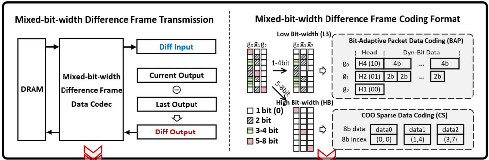 下图展示了本文提出的第三个feature,主要说的是帧间残差矩阵的offchip传输问题。作者设计了一个新的Codec (coder/decoder),将帧间残差根据每个矩阵值的大小分为1/2/4/8b进行传输。1/2/4b的数据进行打包传输,8b的数据由于十分稀疏,所以传输其数据与地址。这其实就是一个经典的优化数据传输的方案,可以理解为dense matrix用结构化数组存储与传输,而sparse matrix采用非结构化数据进行存储与传输的分治策略。