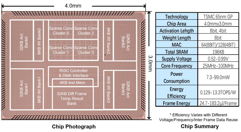 总而言之,该芯片采用65nm制程,芯片大小为$12mm^2$,能降低76.3%的平均功耗并不会产生accuracy loss。在100MHz工作频率,1V的工作电压下,功耗为99mW,吞吐量在85%的weight sparsity ratio(讲道理这个weight sparsity ratio感觉有点高了)以及平均75%的inter frame data reuse的条件下达到了32.8GOPS。
