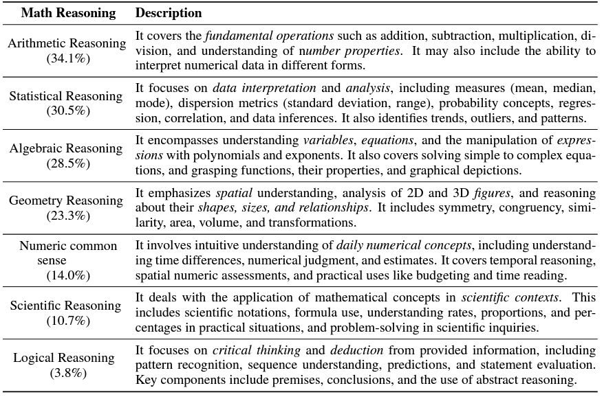 模型的数学推理能力又可细分为以下七个标准,分别是算术推理(ARI),统计推理(STA),代数推理(ALG),几何推理(GEO),数学常识(NUM),科学推理(SCI)以及逻辑推理(LOG)。