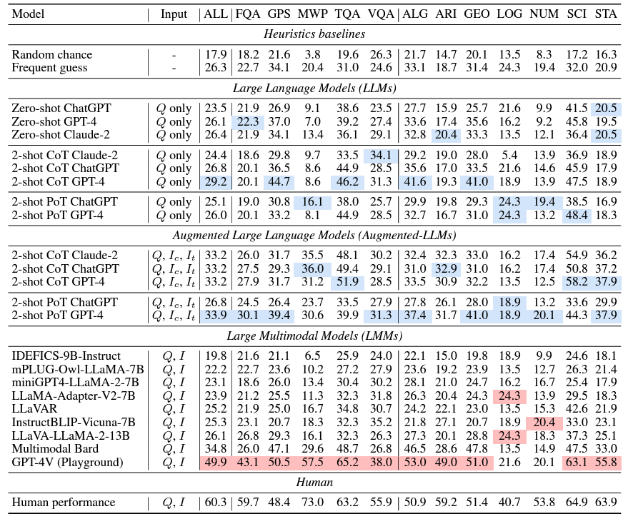 表现最好的模型是GPT-4V,取得了49.9%的平均精度,而人类测试者取得的成绩是65%。