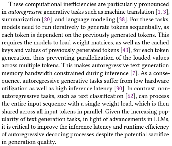 Transformer decoder需要模型反复从片外读入weight矩阵,以及之前生成的tokens的key与value,这导致Transformer decoder的性能被memory bottleneck限制的非常严重。该段论述详见: