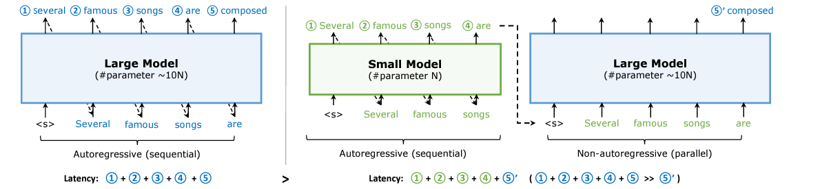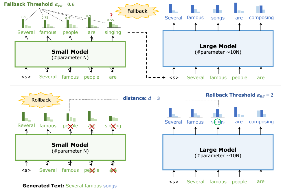 Big Little Decoder包含两个不同大小的模型合作生成文本。小模型会利用fallback policy决定什么时候把workload转到大模型上去。即如果小模型预测出的下一个单词的probability小于一个阈值,那么这个单词将被大模型重新进行预测。同样,大模型会用rollback policy决定什么时候要出来修正小模型的不精确的结果。